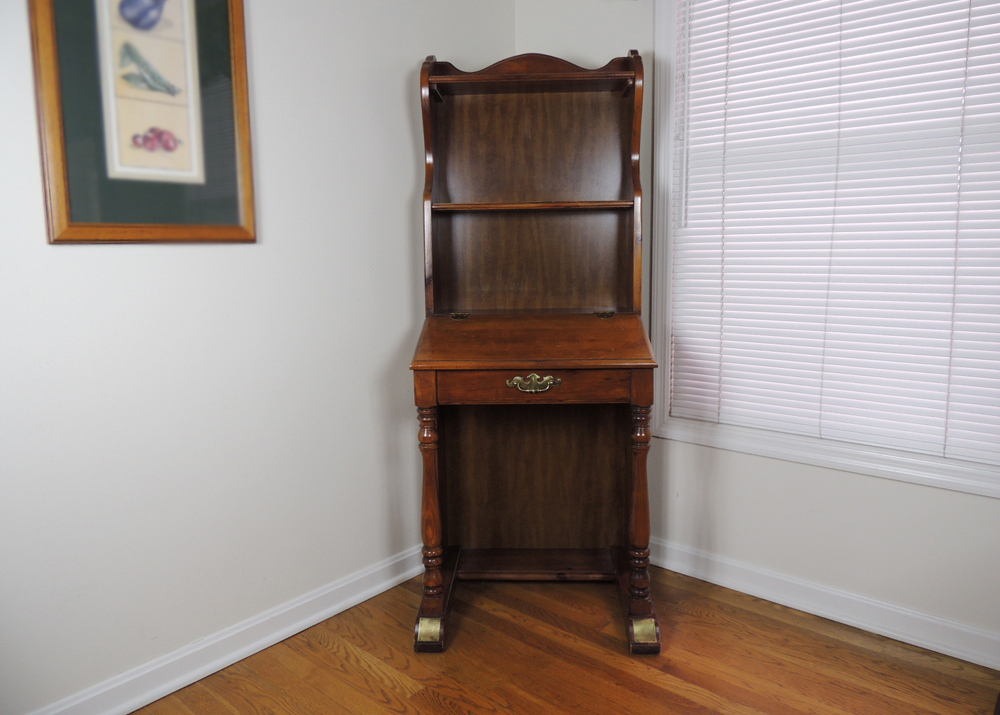 There is a small fold down butler's desk in the middle of the piece with a brown felt writing surface. Get it as soon as tue, mar 30. Ethan allen secretary desk hutch chinoiserie cabinet great for laptop computer. Vintage assistant desks look more like a really traditionally styled cross between a dresser, a hutch, as well as a desk. The is a solid hardwood product and very well made and heavy. This secretary desk with hutch is the ideal modern addition to any room of the house. Vidaxl wooden secretary desk vintage storage french style white carved writing by vidaxl (2) sale. By john stuart, west michigan furniture co. Secretary desks just like telephone benches are a quite cool furniture, as well as they've evolved a fair bit over time. In the dining room, a secretary desk with a glass hutch is a lovely way free up space in your kitchen and display special occasion items. This beautiful antique bookcase cabinet has incredible flame mahogany on its drawers and top crown. 4.5 out of 5 stars. More recent units have automatic mechanisms to raise and lower the top.